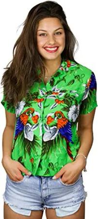 Funky Hawaii-Bluse-Hemd, Damen, Kurzarm, Parrot-Cockatoo, Hell-Grün, XXL