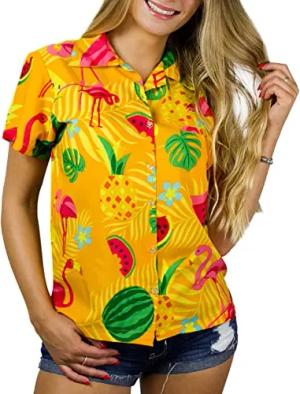 Funky Hawaii-Bluse-Hemd, Damen, Kurzarm, JK-Flamingo-Melon-Print, Gelb, S