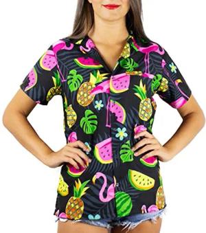 Funky Hawaii-Bluse-Hemd, Damen, Kurzarm, JK-Flamingo-Melon-Print, Schwarz, L
