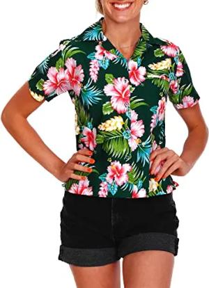 Funky Hawaii-Bluse-Hemd, Damen, Kurzarm, JK-Hibiscus-New, Dunkel-Grün, L