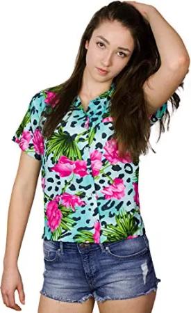 Funky Hawaii-Bluse-Hemd, Damen, Kurzarm, Leopard-Flowers, Hell-Blau, M