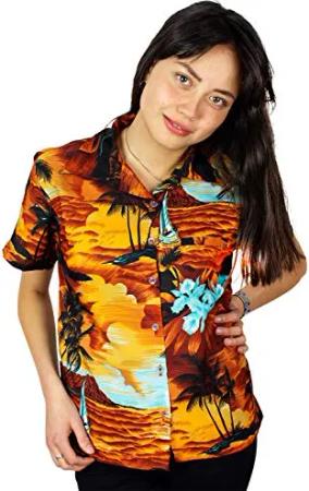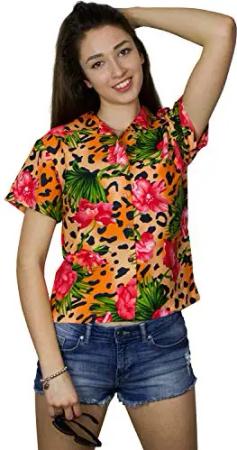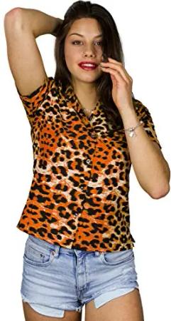 Funky Hawaii-Bluse-Hemd, Damen, Kurzarm, Leopard-Print, Orange, XS