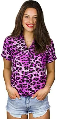 Funky Hawaii-Bluse-Hemd, Damen, Kurzarm, Leopard-Print, Violett, M