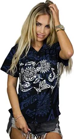Funky Hawaii-Bluse-Hemd, Damen, Kurzarm, Maori-Chest, Schwarz, XS