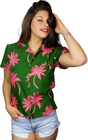 Funky Hawaii-Bluse-Hemd, Damen, Kurzarm, JK-Cherry-ParGrün, Grün, XS
