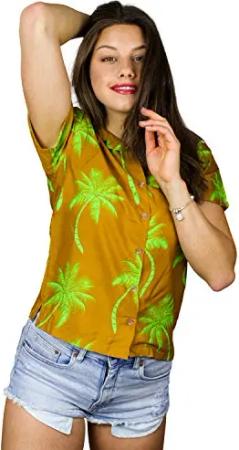 Funky-Hawaii-Bluse-Hemd, Damen, Kurzarm, Palm-Shadow, Mustard-Grün, S