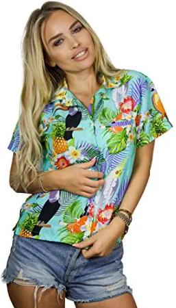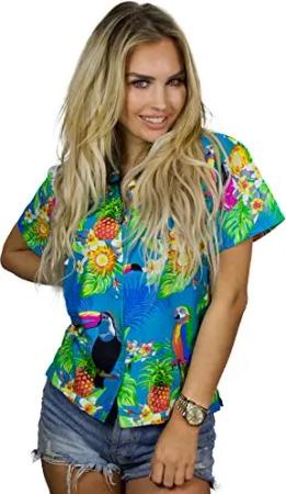 Funky Hawaii-Bluse-Hemd, Damen, Kurzarm, Parrot-Cockatoo, Hell-Blau, XL
