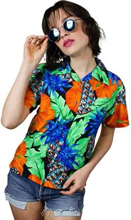 Funky Hawaii-Bluse-Hemd, Damen, Kurzarm, Pineapple-Flowers, Orange, XL