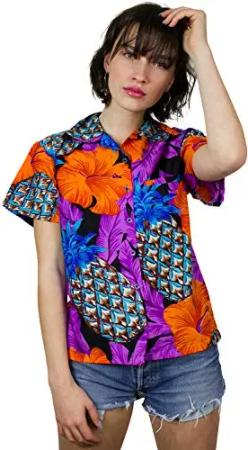 Funky Hawaii-Bluse-Hemd, Damen, Kurzarm, Pineapple-Hibiscus, Schwarz-Violett, XL