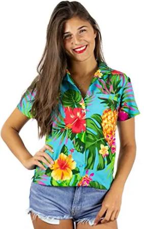 Funky Hawaii-Bluse-Hemd, Damen, Kurzarm, Pineapple-Hibiscus, Türkis, XS
