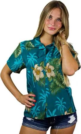 Funky-Hawaii-Bluse-Hemd, Damen, Kurzarm, Surf, Dunkel-Türkis, L