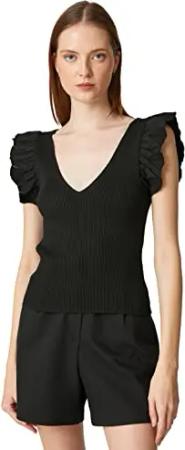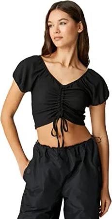 Damen Crop Puff Sleeve Shirred V Neck T-Shirt, Black (999), XL EU