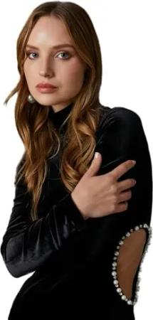 Women High Neck Long Sleeve Pearl Cut Out Detail Midi Velvet Dress