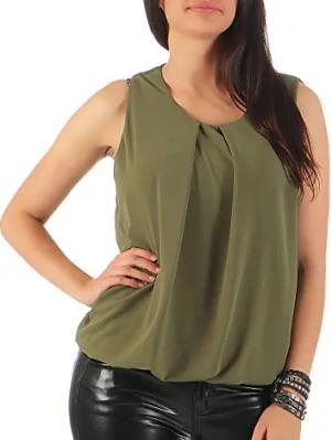 Malito – Damen Bluse ärmellos – leichte Tunika ohne Ärmel – Elegante Schlupfbluse mit Rundhals – lockeres Blusenshirt für Frauen Leo Print und Uni 6879 - (Oliv)