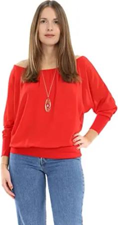 Malito – Damen Bluse schulterfrei mit Kette – Langarm Tunika mit elastischen Ärmelbündchen – Oversize Blusenshirt 1133 (Rot)
