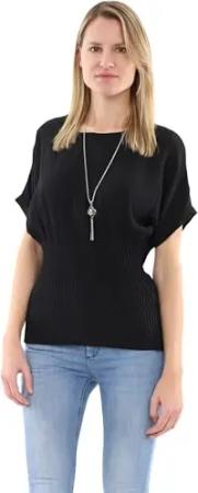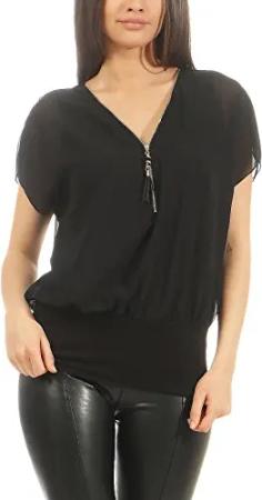 Malito Damen Kurzarm Bluse im Fledermaus Look | Tunika mit Zipper | T-Shirt mit breitem Bund | Shirt - elegant 6298 (schwarz)