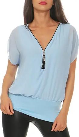Malito Damen Kurzarm Bluse im Fledermaus Look | Tunika mit Zipper | T-Shirt mit breitem Bund | Shirt - elegant 6298 (hellblau)