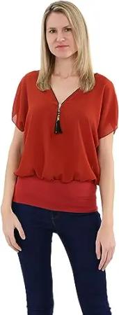 Malito Damen Kurzarm Bluse im Fledermaus Look | Tunika mit Zipper | T-Shirt mit breitem Bund | Shirt - elegant 6298 (rost)