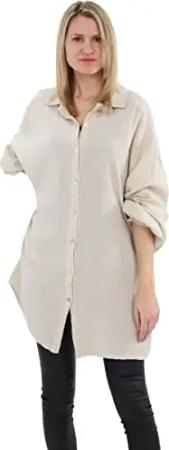 Malito Damen Musselin Bluse - Langarm Blusenhemd - langes Oversize Hemd aus Baumwolle - Long Shirt Strand Cover Up 20914 (beige 34-46)
