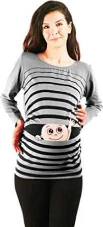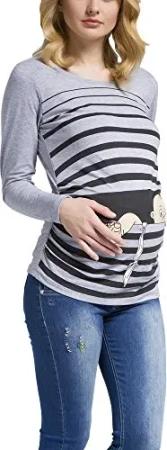 Winke Winke Baby - Lustige witzige süße Umstandsmode gestreiftes Umstandsshirt mit Motiv für die Schwangerschaft, Langarm (Grau, Small)
