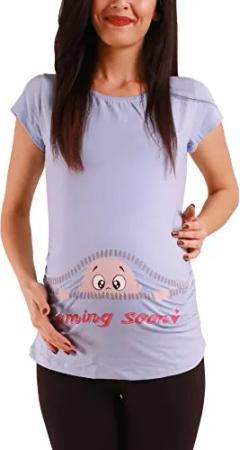 Coming Soon - Lustige witzige süße Umstandsmode mit Motiv Umstandsshirt für die Schwangerschaft T-Shirt Schwangerschaftsshirt, Kurzarm (Babyblau, X-Large)
