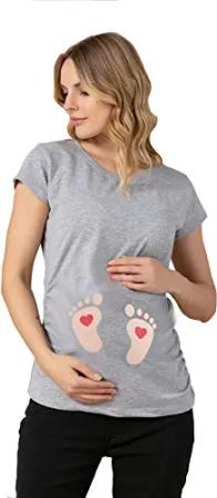 Fußabdrücke Baby mit Herz - Lustige witzige süße Umstandsmode mit Motiv Umstandsshirt für die Schwangerschaft T-Shirt Schwangerschaftsshirt, Kurzarm (Grau, Large)