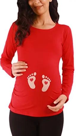 Fußabdrücke Baby mit Herz - Süße Umstandsmode Motiv Umstandsshirt Sweatshirt Schwangerschaftsshirt für die Schwangerschaft, Langarm (Rot, Medium)