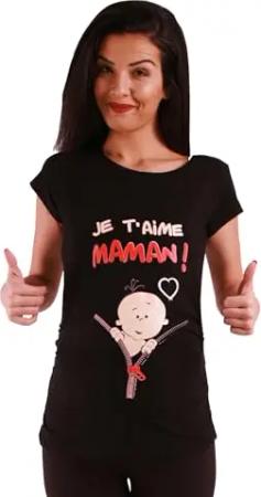 Je T'Aime Maman - Lustige witzige süße Umstandsmode mit Motiv Umstandsshirt für die Schwangerschaft T-Shirt Schwangerschaftsshirt, Kurzarm (Schwarz, Small)