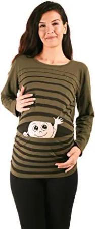 Winke Winke Baby - Lustige witzige süße Umstandsmode gestreiftes Umstandsshirt mit Motiv für die Schwangerschaft, Langarm (Khaki, Medium)