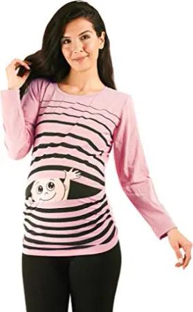 Winke Winke Baby - Lustige witzige süße Umstandsmode gestreiftes Umstandsshirt mit Motiv für die Schwangerschaft, Langarm (Rosa, Medium)