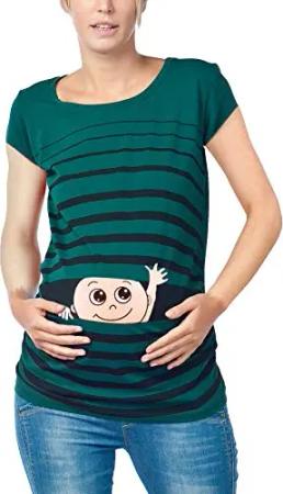 Winke Winke Baby - Lustige witzige süße Umstandsmode gestreiftes Umstandsshirt mit Motiv für die Schwangerschaft Schwangerschaftsshirt, Kurzarm (Dunkelgrün, Small)