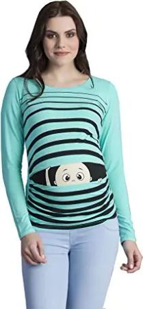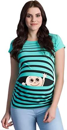 Winke Winke Baby - Lustige witzige süße Umstandsmode gestreiftes Umstandsshirt mit Motiv für die Schwangerschaft Schwangerschaftsshirt, Kurzarm (Mint, Small)