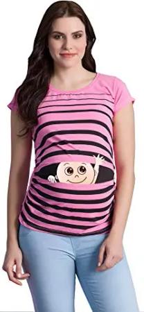 Winke Winke Baby - Lustige witzige süße Umstandsmode gestreiftes Umstandsshirt mit Motiv für die Schwangerschaft Schwangerschaftsshirt, Kurzarm (Rosa, Small)