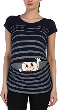 Winke Winke Baby - Lustige witzige süße Umstandsmode gestreiftes Umstandsshirt mit Motiv für die Schwangerschaft Schwangerschaftsshirt, Kurzarm (Dunkelblau, Small)