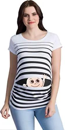 Winke Winke Baby - Lustige witzige süße Umstandsmode gestreiftes Umstandsshirt mit Motiv für die Schwangerschaft Schwangerschaftsshirt, Kurzarm (Weiß, Medium)
