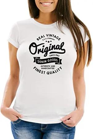 Cooles Damen T-Shirt Original Denim Goods Vintage Druck Original Slim Fit Weiss XS
