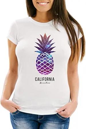 Damen T-Shirt Ananas Galaxy Galaxie Wasser Ozean Slim Fit Weiss-Galaxy M