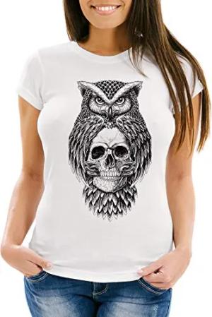 Damen T-Shirt Eule Totenkopf Owl Skull Schädel Slim Fit Weiss XXL