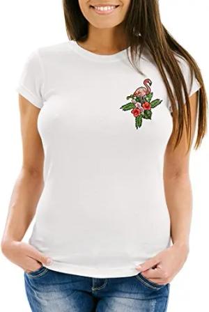 Damen T-Shirt Flamingo Tropical Palmblätter Sommer Stick-Patch-Optik Slim Fit Weiss XS