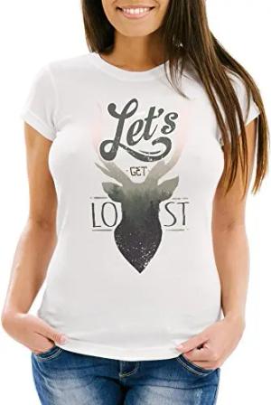 Damen T-Shirt Hirsch Geweih Kopf Deer - Let`s get Lost - Adventure Slim Fit Weiss M