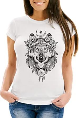 Damen T-Shirt Wolf Traumfänger Atzekenmuster Boho Bohamian Atzec Ethno Weiss S