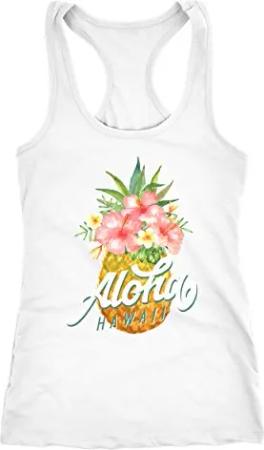 Damen Tank-Top Ananas Aloha Hawaii Blumen Tropical Paradise Racerback Slim Fit tailliert Baumwolle Weiss L