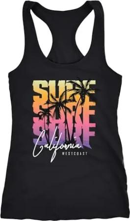 Damen Tank-Top Sommer Surf California Palmen Racerback schwarz-pink S