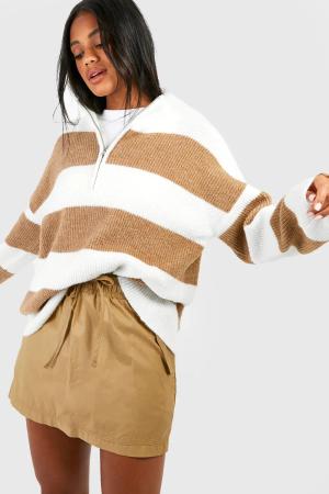 Gestreifter Strickpullover Mit Halbem Reißverschluss - Taupe - S, Taupe