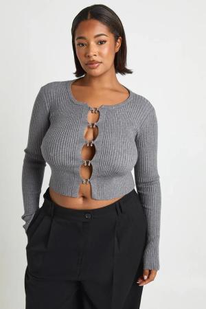 Plus Gerippter Cardigan Mit Haken-Detail - Charcoal - 50, Charcoal