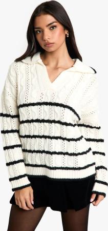 Weicher Gestreifter Zopfmuster-Pullover Mit Polo-Kragen - Ecru - M, Ecru