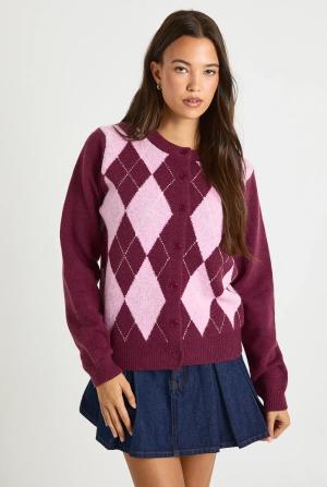 Womens Argyle Button Through Knitted Cardigan - Burgundy - S, Burgundy