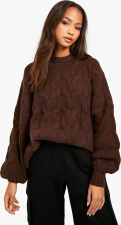 Womens Fluffy Cable Knit Crew Neck Jumper - Chocolate - S, Chocolate