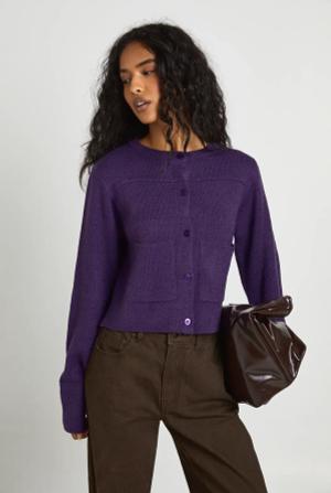 Womens Pocket Detail Crew Neck Knitted Cardigan - Aubergine - S, Aubergine