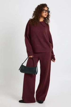 Womens Super Soft Crew Neck Knitted Chunky Jumper And Wide Leg Trouser Co-Ord - Burgundy - M, Burgundy
